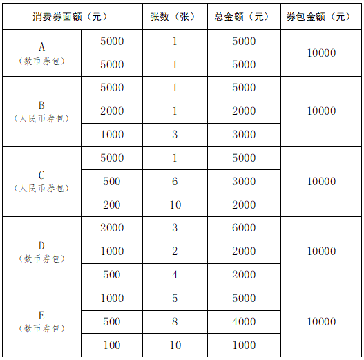 消费券设置:本次消费券使用范围为“建行生活”APP内商超百货、家具家电、餐饮娱乐、住宿等全品类业态,总价值10000元(消费金额大于消费券面额即可核销使用),消费者可选择人民币券包或者数字人民币券包(以下简称数币券包,其中数币券包需开通建行二类及以上数币钱包核销),券包面额搭配分为A、B、C、D、E五个种类,其中A、D、E为数币券包,B、C为人民币券包,符合派券条件的消费者可任选其一。券面设置如下: