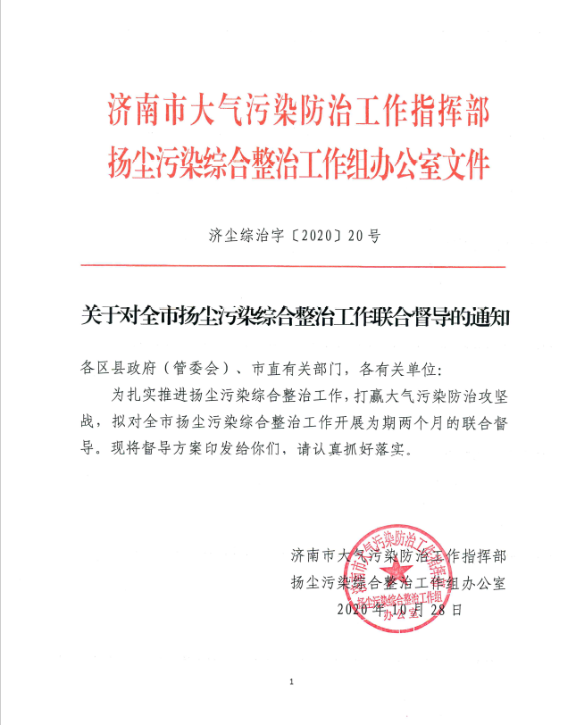 10月28日,市扬尘办印发《关于对全市扬尘污染综合整治联合督导的通知》,对全市扬尘污染综合整治工作开展为期两个月的联合督导。当天下午,市住建局、城管局等多部门联合开展扬尘督导检查,对存在问题的两处道路积尘污染源,现场向属地及行业主管部门移交。